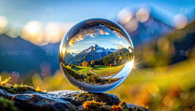 Горный пейзаж, отражающийся в кристаллической сфере, передает идеи перспективы, осознанности, путешествий чудес, сезонной красоты и захватывающих приключений на свежем воздухе в солнечной альпийской долине