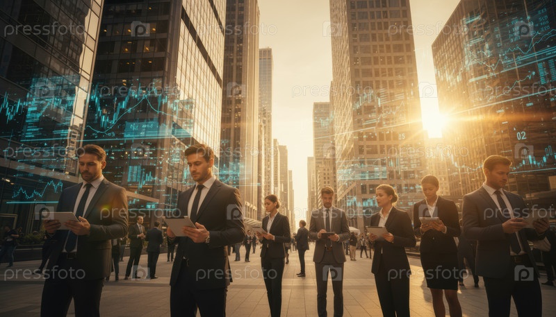 Бизнес-профессионалы, анализирующие финансовые данные в современном городском ландшафте, изображают взаимосвязанный мир цифровых финансов, фондовых рынков и глобальной экономической трансформации на рассвете