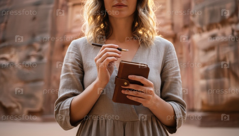 Молодая путешественница держит кожаную тетрадь и ручку в солнечной древней каменной аллее, захватывая праздничные воспоминания во время золотого часа осени