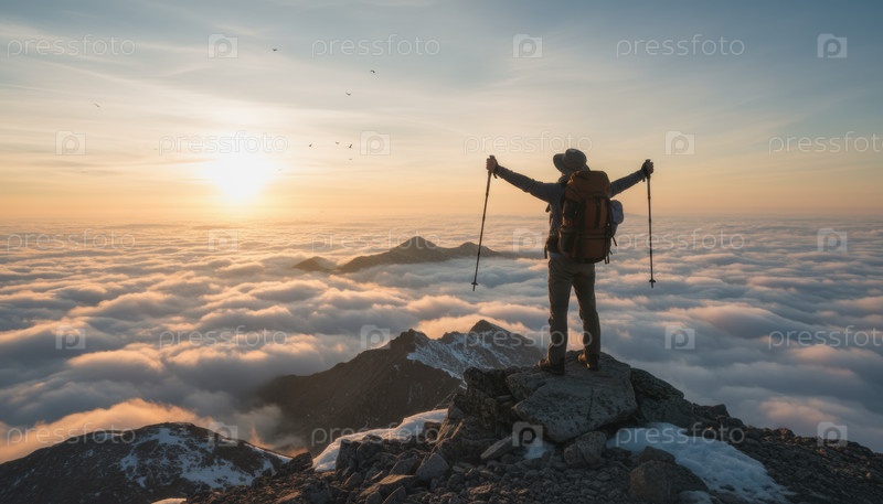 Триумф на вершине горы, представляющий желание приключений и оптимизм восхода солнца над облачным морским пейзажем