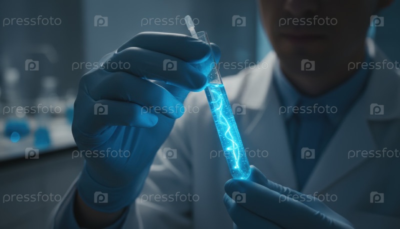 Светящаяся синяя жидкость в лабораторной пробирке символизирует прогресс биотехнологии, научные открытия и высокотехнологичные исследования для будущих медицинских инноваций