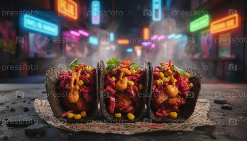 Уличная кухня Тако с яркими цветами, представляющей глобальную тенденцию городской ночной жизни и современного кулинарного творчества
