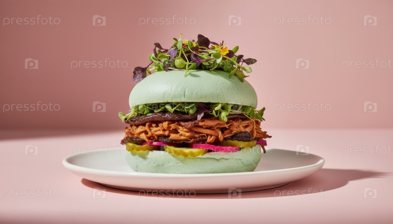Концепция гурманского гамбургера с уникальной булочкой, символизирующей инновации в современной кухне и современном дизайне пищи