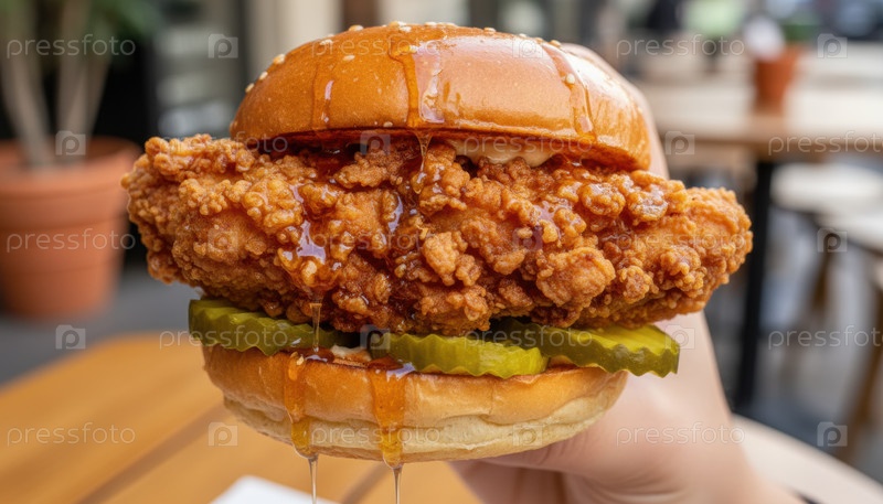 Сэндвич с хрустящим жареным цыпленком с маринованной и медным глазурем, который хранится на открытом воздухе, идеально подходит для фестиваля уличной кухни, случайного перерыва на обед и тяги к еде