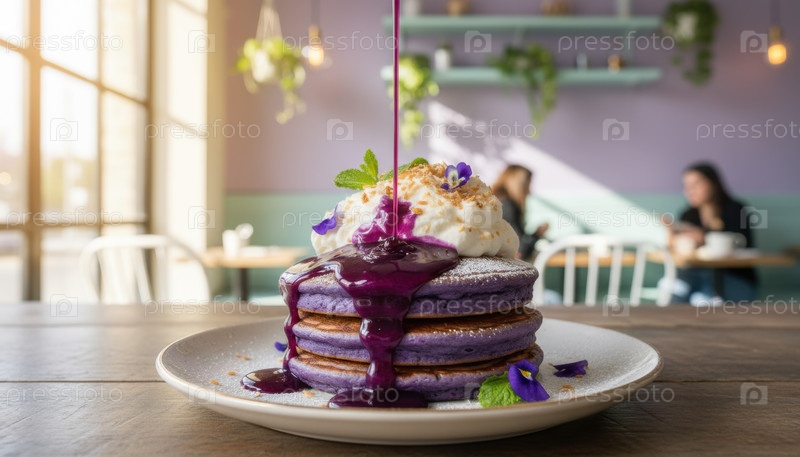 Красочная упаковка блинов с фиолетовым сиропом в модном кафе-бранче, символ инстаграммируемой культуры комфорта и утренних выходных