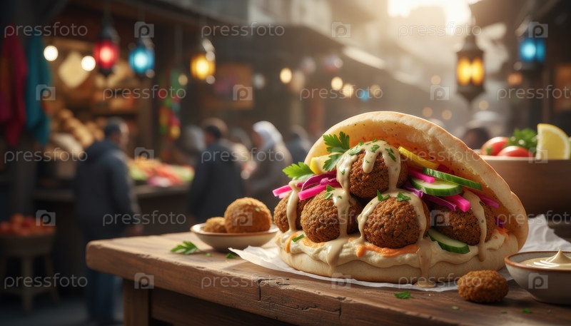 Фалафель Питы наполнен свежими овощами и тахини в оживленной уличной сцене базара, символизируя растительную фаст-фуд и путешествия по Ближнему Востоку