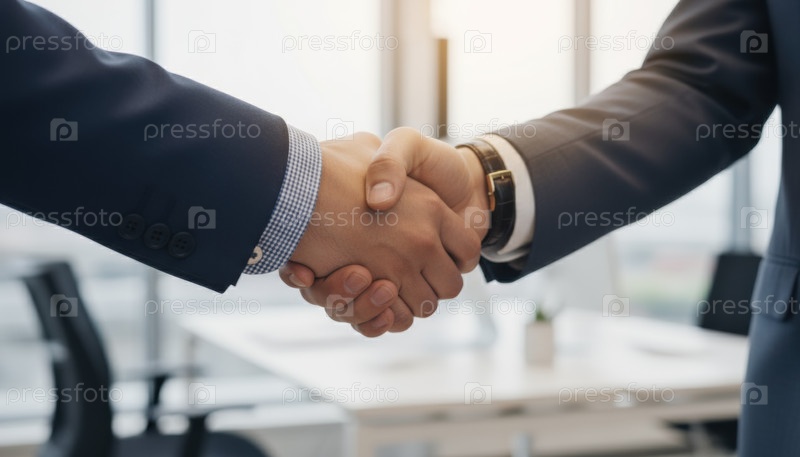 Бизнес-партнеры в официальных костюмах пожимают друг другу руки в ярком офисе, представляя успешное закрытие сделки, корпоративное партнерство и профессиональное укрепление доверия
