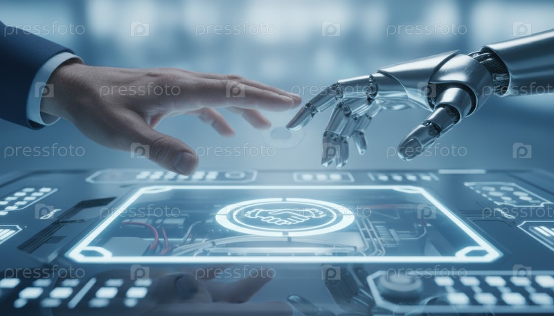 Человеческая рука стремится к роботизированной руке через футуристический интерфейс, иллюстрирующий сотрудничество между людьми, инновационный саммит и будущее работы