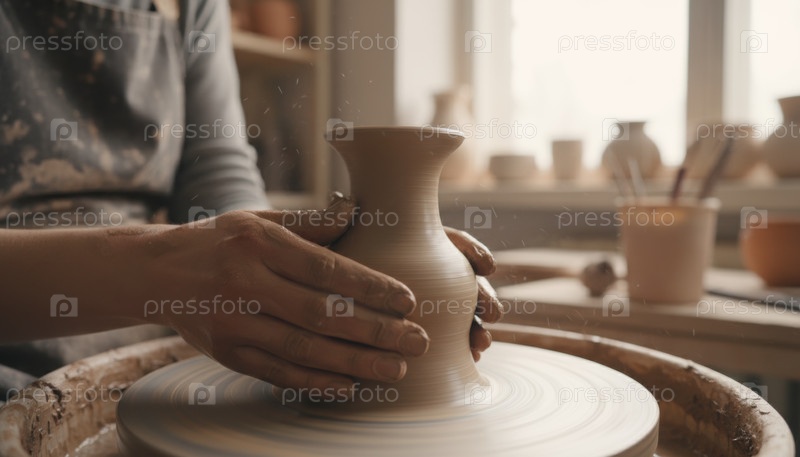 Ремесленник формирует глиняный горшок на колесе, показывая тенденцию возрождения ремесел, традиции ручной работы, творческую студийную работу, символ медленных живых движений сегодня