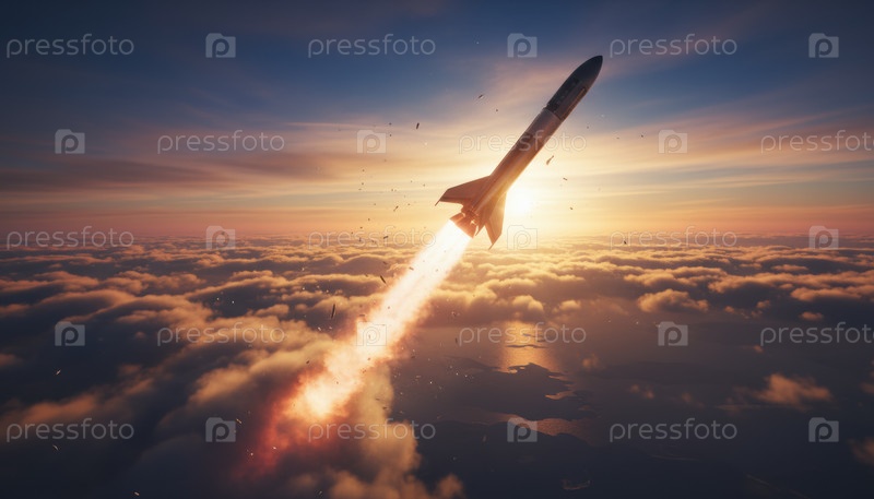 Ракета, движущаяся над облаками восхода солнца над океаном - это метафора прорывных инноваций, амбициозных стартапов и трансцендентности человечества