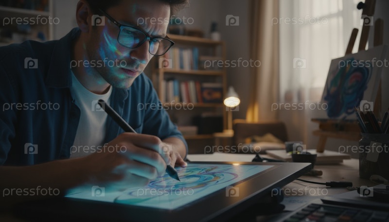 Сосредоточенный цифровой художник, работающий поздно вечером за светящимся планшетом в уютной студии, захватывает творческий поток удаленной работы, фрилансинга и современного визуального повествования
