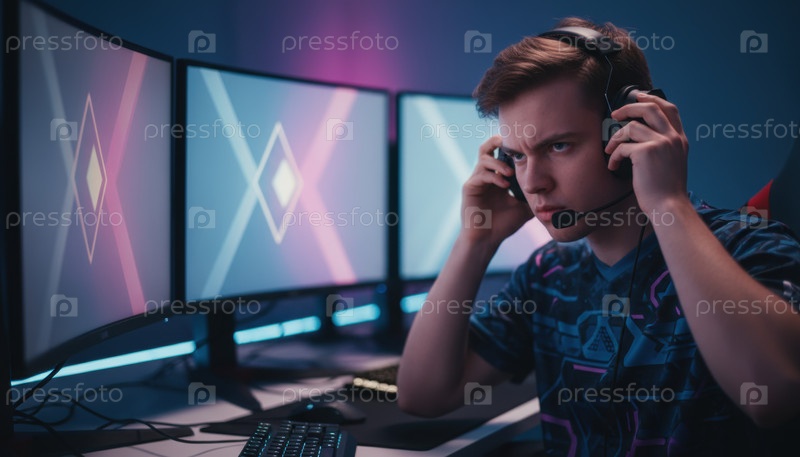 Серьезный геймер, одетый в наушники перед несколькими мониторами, символизирующими соревнования по киберспорту, культуру прямой трансляции и рост профессиональных онлайн-игр