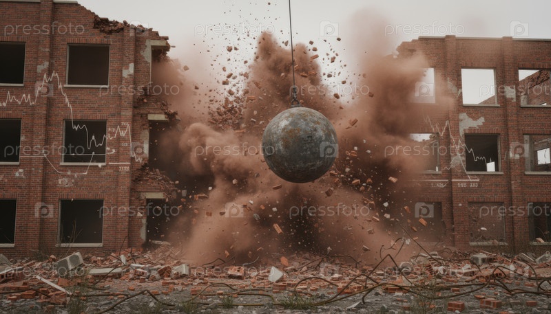 Разрушительный шар, разбивающий старое кирпичное здание пылью и обломками, визуализирует финансовый кризис, крах рынка или разрушительные изменения, уничтожающие устаревшие структуры