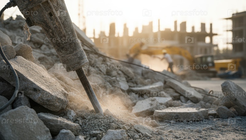Джекхаммер разбивает бетонные обломки на пыльной строительной площадке, изображая инфраструктуру реконструкции города, возобновление тяжелого труда и оживленную сцену рабочего дня в городе