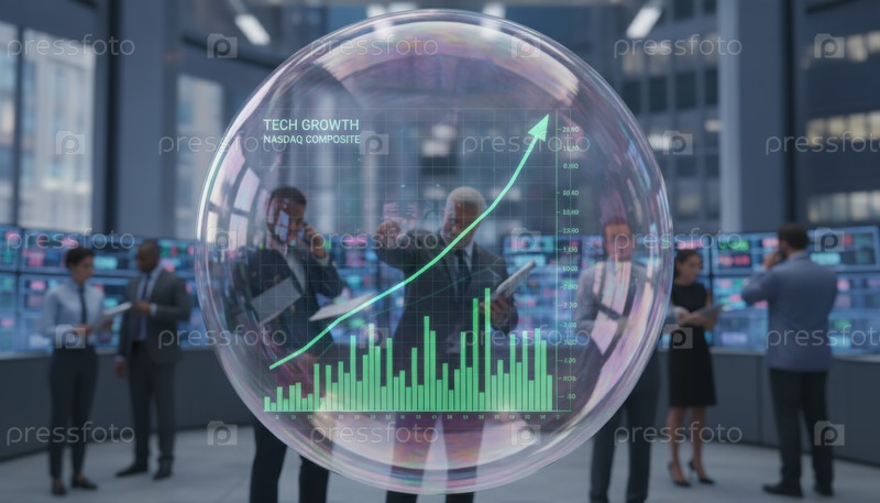 Бумный технологический пузырь Nasdaq был визуализирован в стеклянной сфере над оживленным рынком, символизирующим спекулятивные рынки и будущие инновационные тенденции