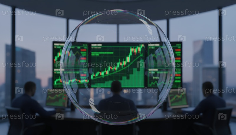 Прозрачный пузырь над трейдерами и зеленые фондовые графики, метафора финансового пузыря, спекулятивный риск, криптомания и хрупкий рыночный оптимизм
