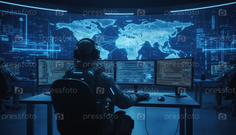 Высокотехнологичный командный центр кибербезопасности, где солдаты отслеживают карты и коды, символизирующие цифровую войну, операции по безопасности и глобальный мониторинг данных