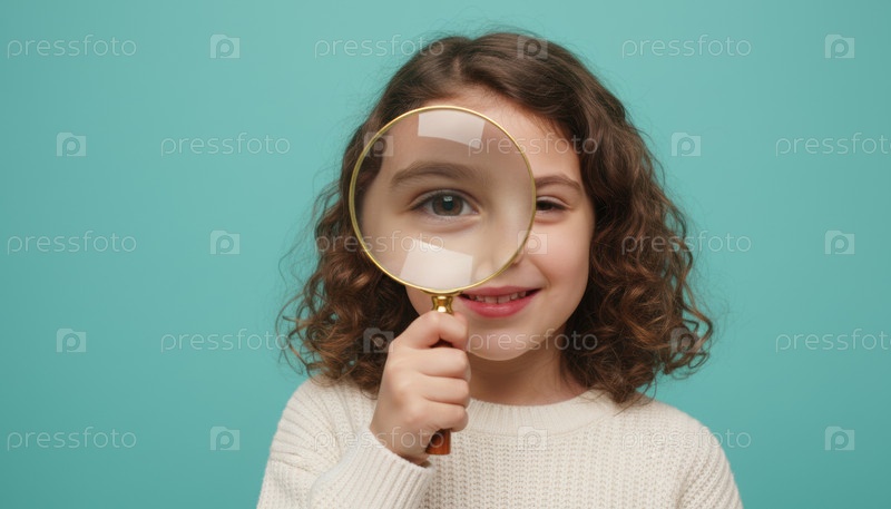Любопытный ребенок смотрит через лупу, символ раннего научного образования, мышление открытия и игривое возвращение в школу