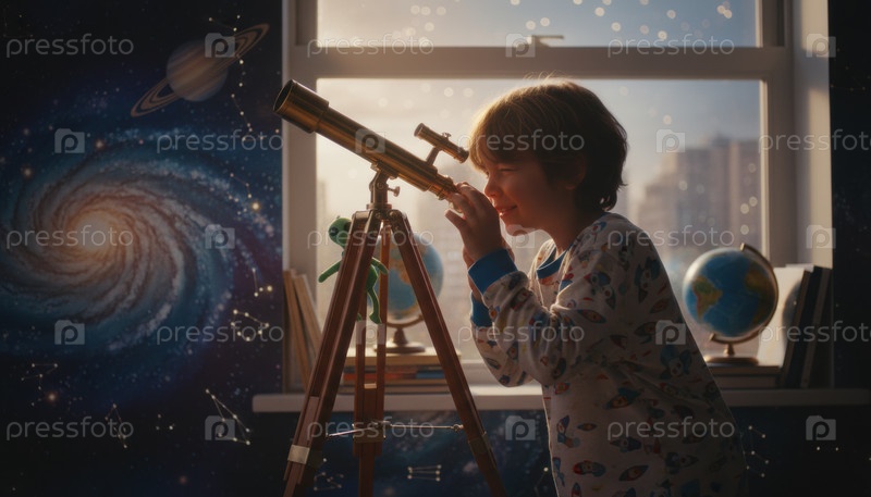 Улыбающийся мальчик смотрит на ночное небо через телескоп в спальне с космической тематикой, символом астрономических увлечений, детского чуда и научной ночи
