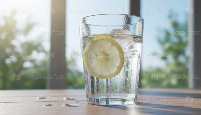 Освежающий стакан газировки с лимонным кусочком на солнечном столе предлагает летние детоксикационные тенденции и привычки здорового образа жизни