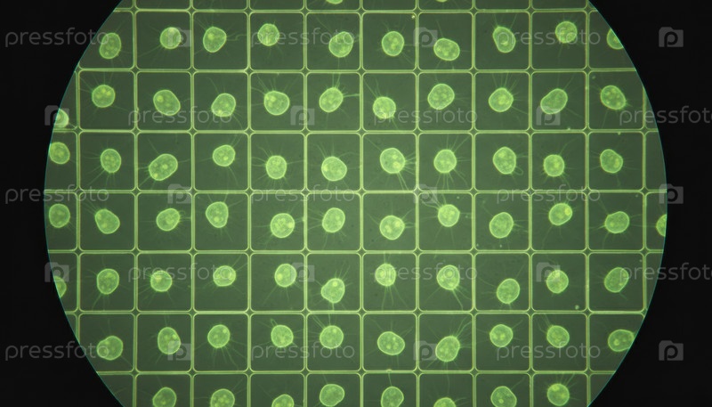 Флуоресцентные клетки расположены в точной сетке под микроскопом, представляя биотехнологические инновации, лабораторные исследования и будущее персонализированной медицины