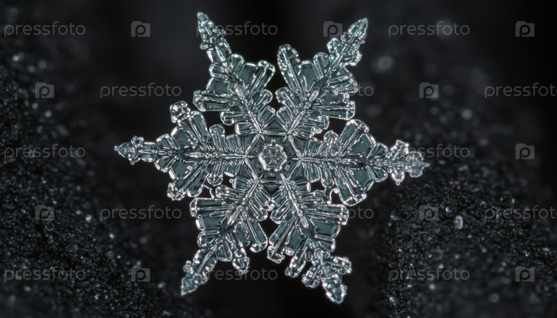 Один кристалл снежинки, опирающийся на темную ткань макрозимнего чуда природы для рождественского сезона, осведомленность о климате и уникальность каждого замороженного образца