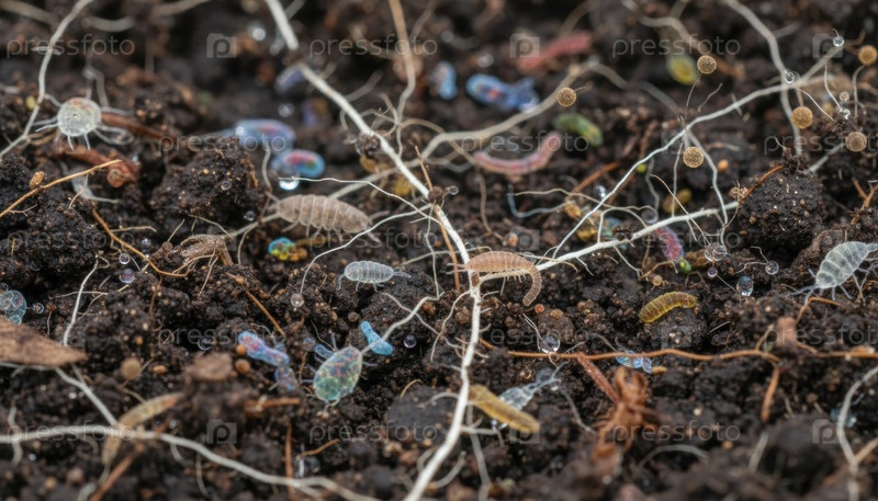 Микроскопическая почвенная экосистема с крошечными беспозвоночными и корнями, иллюстрирующими биоразнообразие, климатический углеродный цикл, сельское хозяйство и будущее регенеративного сельского хозяйства