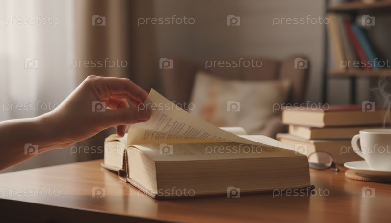 Спокойный момент чтения в теплом интерьере, символизирующий обучение, размышления, спокойное настроение на выходных и нежный отдых от быстрого цифрового мира