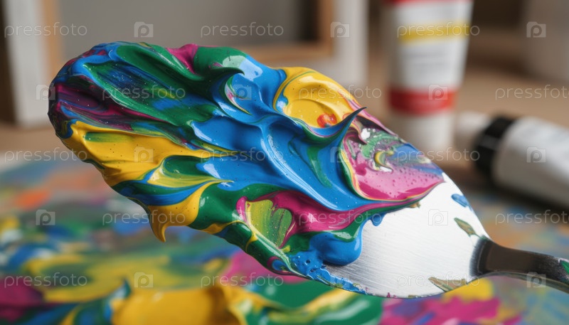 Яркая краска на палитре ножей, представляющая творчество, художественный эксперимент, современную визуальную концепцию и смелое выражение через динамическое сочетание цветов