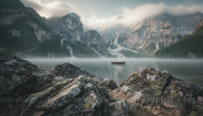 Мигающее горное озеро на рассвете с одинокой деревянной лодкой и скалистым берегом в переднем плане, символ тихого путешествия и устойчивого природного туризма