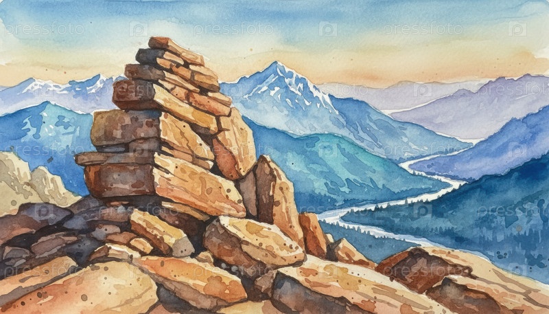 Куча теплых скал в горном пейзаже над извилистой рекой, акварельный вид для походов медитации свободы эко-путешествия в Альпы или Колорадо на рассвете