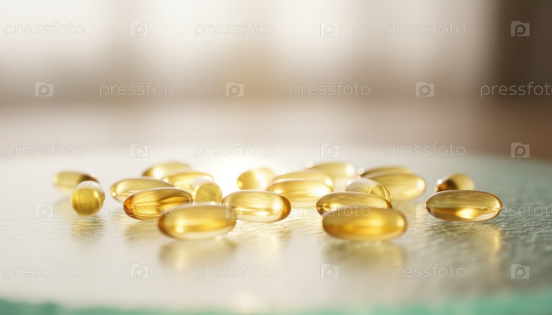 Золотые капсулы мягкого геля на светлой поверхности, символизирующие ежедневный витаминный режим иммунной поддержки для здорового старения и современного профилактического образа жизни