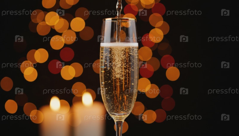 Сверкающее шампанское, залитое в высокое стекло с золотым боке и свечами, символизирует новогодний праздник романтики, роскошный ужин и праздничное настроение