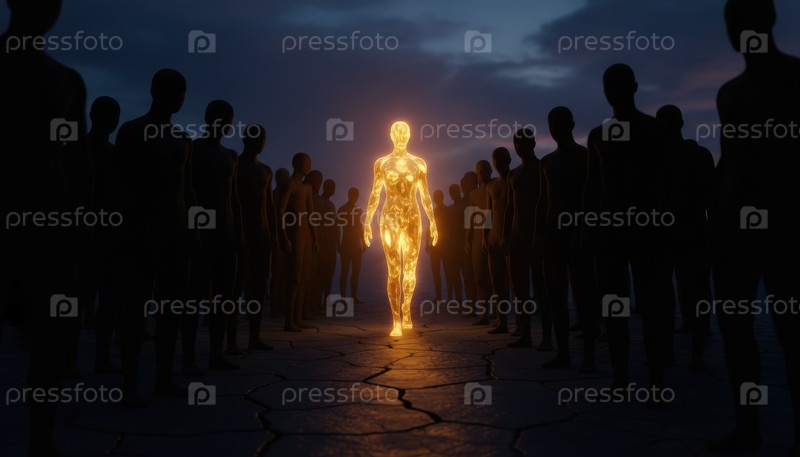 Блестящая человеческая фигура ходит среди силуэтов, символизирующих просветление индивидуальности и внутреннюю трансформацию