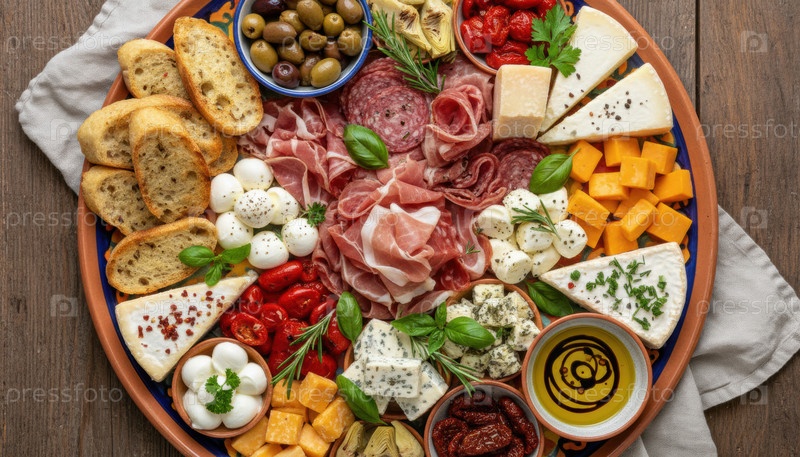 Богатое блюдо для антипасто с сыром, оливковым хлебом и сушеным мясом отмечает средиземноморский культурный уик-энд и праздничный праздничный стол