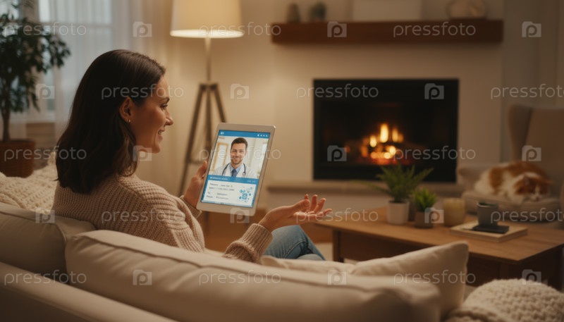 Молодая женщина расслабляется дома, общается с дружелюбным онлайн-врачом на планшете, иллюстрирует уютный зимний вечер с посещением телемедицины