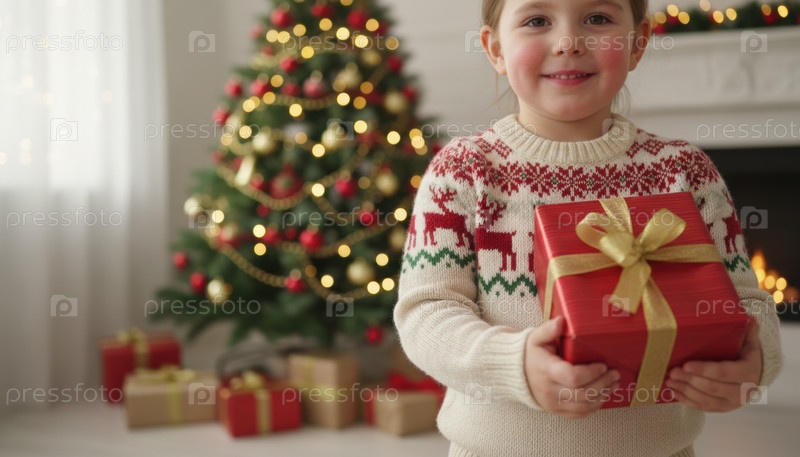 Улыбающийся ребенок в праздничном свитере держит упакованный подарок перед украшенной рождественской елкой.Концепция праздничной традиции, семейного отдыха и волшебной зимы дарования