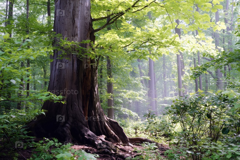 Старое большое дерево в зеленом лесу. естественный фон с копировальным пространством