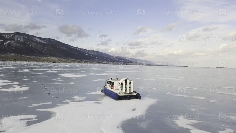 Транспорт на самолете по замерзшему Байкальскому озеру в Сибири, Россия.Воздушный вид живописного зимнего пейзажа с высокими горами, замороженным озером и синим облачным небом