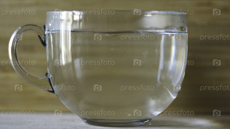 Инфузия горячей воды в большую прозрачную чашку на размытом деревянном фоне. Концепция. Боковой вид пустой чашки и процесс приготовления горячей воды для утреннего горячего напитка