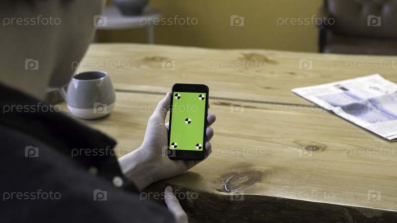 Вид через плечо бизнесмена, использующего портативный сотовый телефон с зеленым сенсорным экраном на деревянном столе