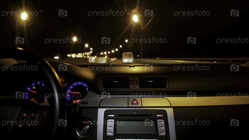Автомобиль ездит ночью. Вождение автомобиля по городу - это вид изнутри. Таймлэпс вождения ночью с камерой в машине