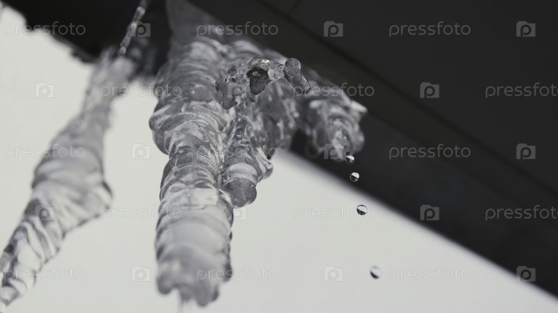 Нижний вид таяющего айсикла, висящего с крыши весной. резервные кадры. Вода капает из айсикла на фоне серого неба