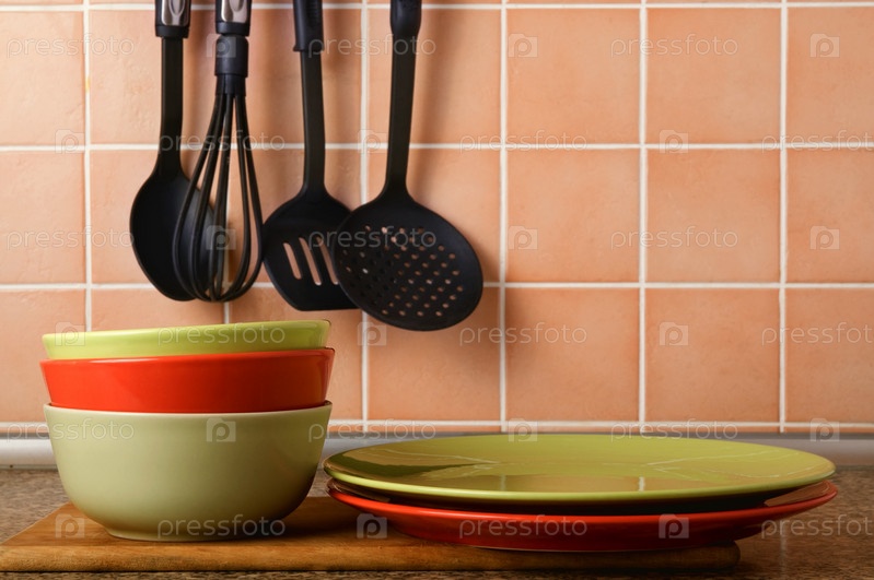 Стопка тарелок на фоне керамической плитки
