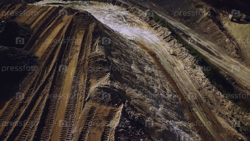 Верхний тип песчаного карьера, добыча природных ресурсов или руды, концепция тяжелой промышленности. резервные кадры. воздушный карьер со многими колесными треками