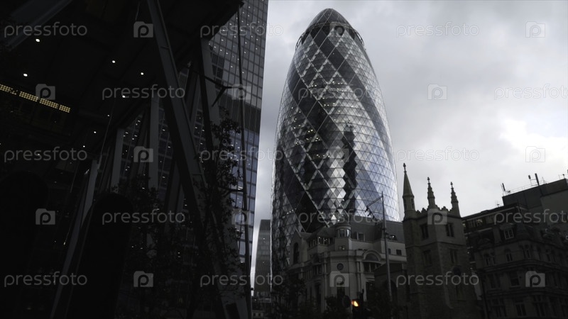 Вид на современный небоскреб Mary Axe, расположенный в Лондоне (Великобритания).Продолжайте.Впечатляющий небоскреб необычной формы со стеклянным фасадом на фоне облачного неба