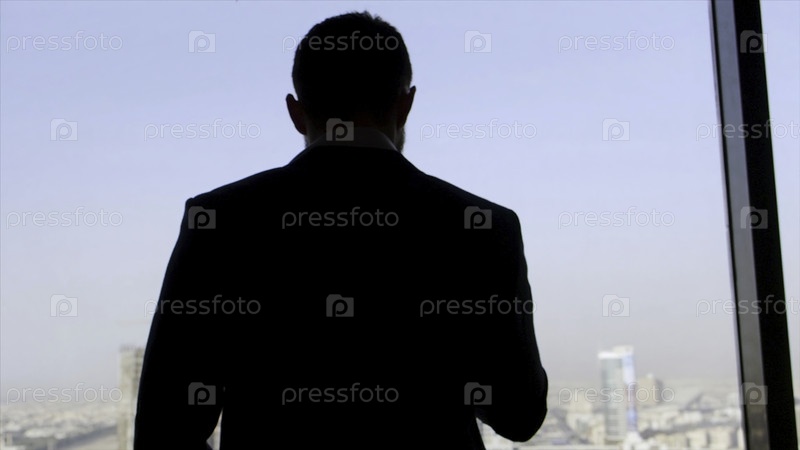 Вид бизнесмена в костюме, стоящего со смартфоном в руке и смотрящего из окна.Сток.Глава компании у окна, вид с небоскреба на город