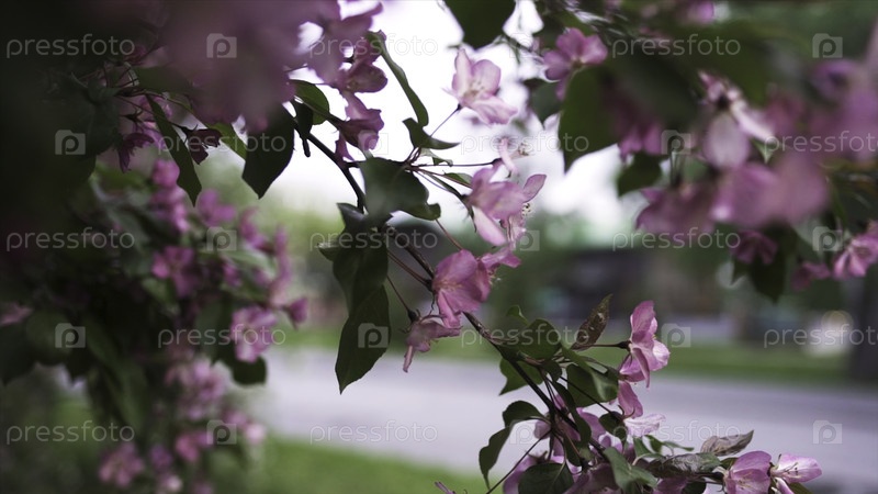 Закройте для ярко-розовой вишневой ветви на фоне городской улицы, весенний цвет и концепция садоводства