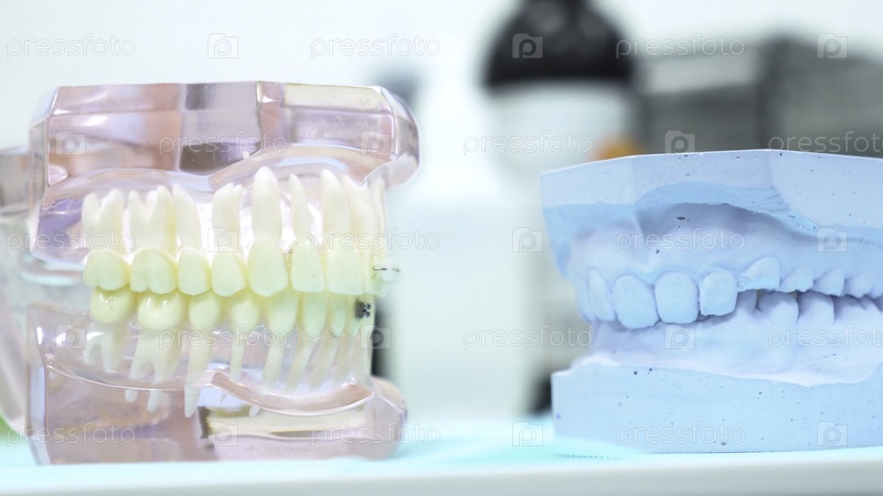 Модель челюсти на столе в стоматологической клинике, уход за зубами и концепция медицины
