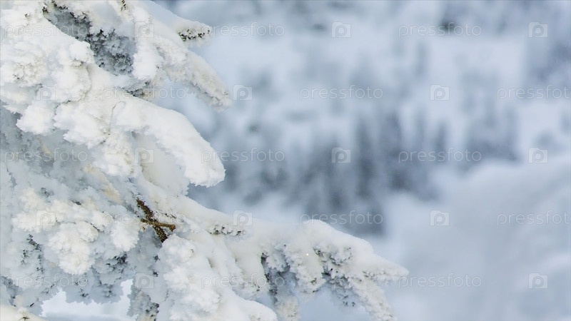 Снежные горные вершины и деревья в горнолыжном курорте. видео. верхняя часть ветви деревьев покрыта зимним белым снегом, с зелёным густым сосновым лесом и многими пиками